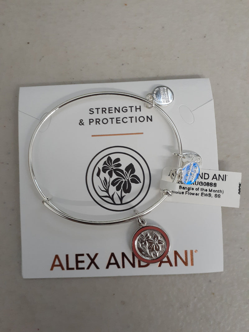 Alex and Ani August Bangle Bracelet GLADIOLUS Flower Shiny Silver New Tag Box
