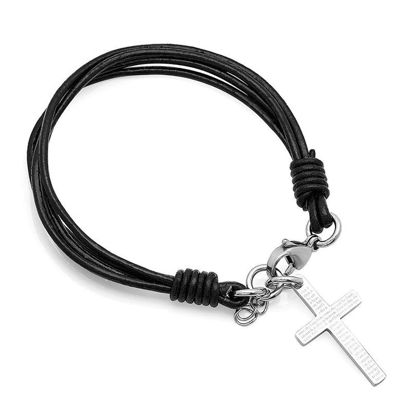 Ladies Mens Unisex Genuine Black Leather Bracelet With Stainless Steel Cross Lords Prayer