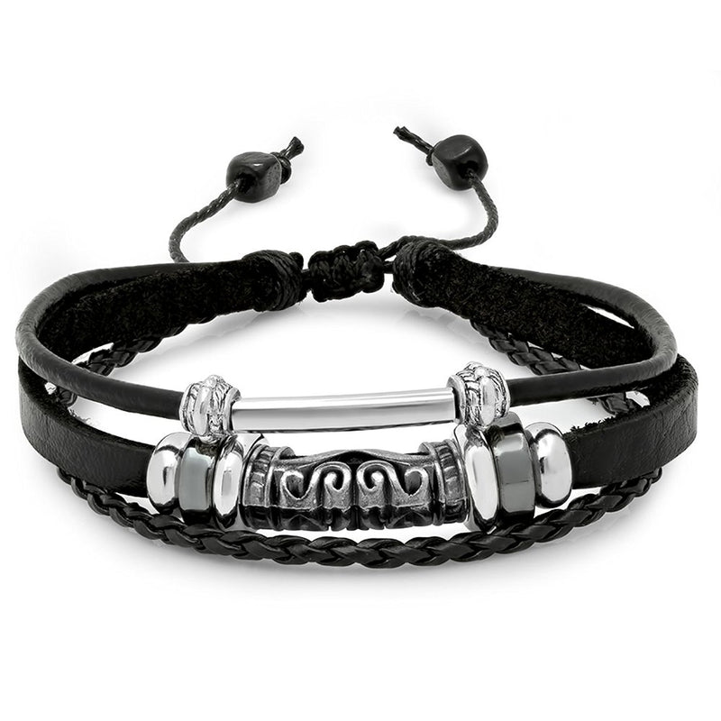 Men's Black Genuine Leather Bracelet With Alloy Medallion Rope Wrap