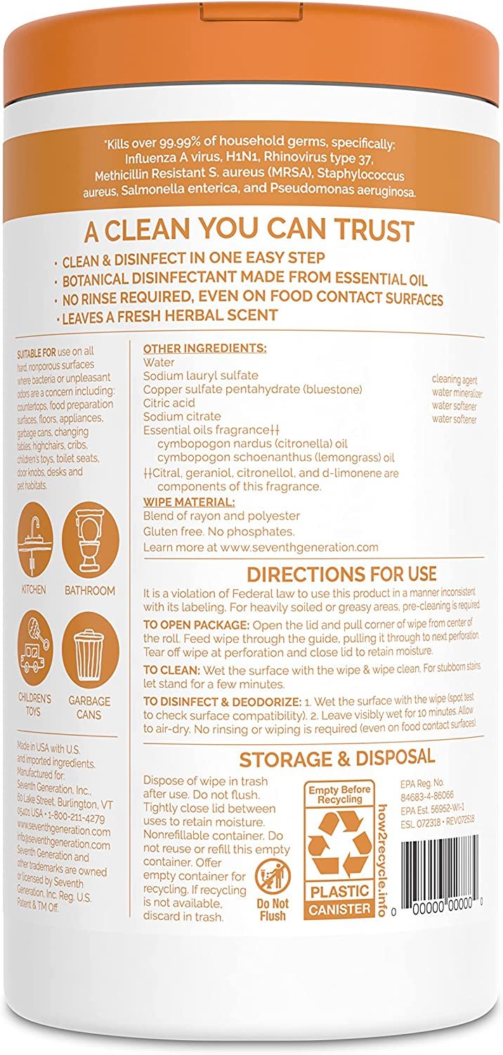 Seventh Generation Disinfecting Multi-Surface Wipes, Lemongrass Citrus Scent, 70 Wipes