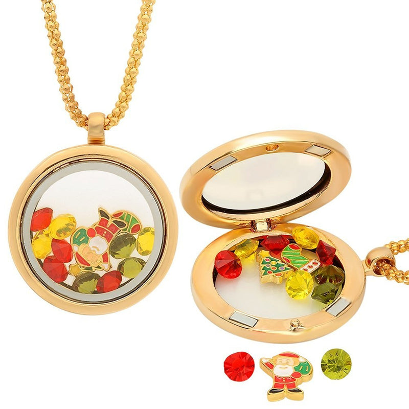 Steeltime Women's 622042PK 18kt Gold Plated Round Pendant Locket with Xmas and Multicolor Simulated Gemstones Charms
