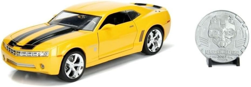2006 Chevy Camaro Concept Yellow Bumblebee with Robot on Chassis and Collectible Metal Coin Transformers Movie 1/24 Diecast Model Car by Jada 98497