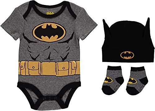 DC Comics Batman Baby Clothes 3-Piece Set with Bodysuit, Baby Hat, and Baby Socks - Batman Baby Gift Set (Black/Yellow, 6-9M)