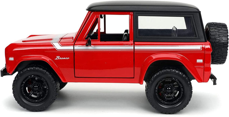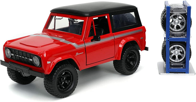 1973 Ford Bronco Red with Black Top and Silver Stripe with Extra Wheels Just Trucks Series 1/24 Diecast Model Car by Jada 32425